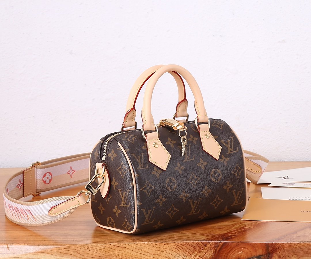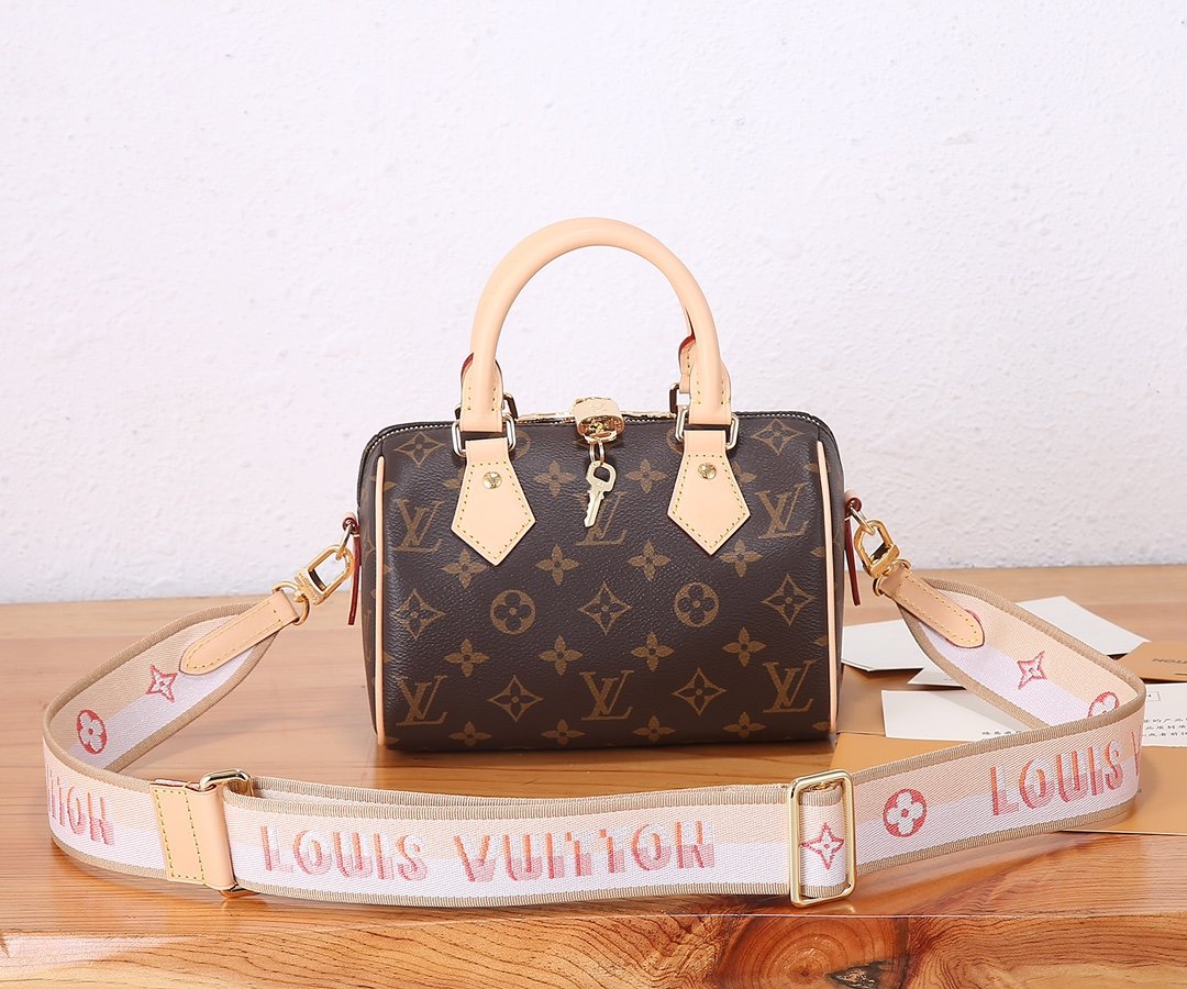 ‼️ Top tier original order, enhanced version ‼️ Speedy Bandouli The è re 20 handbag features Monogram canvas, cowhide trim, and fabric lining, continuing the classic design of the Louis Vuitton Speedy travel bag in exquisite size. It is paired with a rolled leather handle and a detachable and adjustable fabric shoulder strap embellished with the brand logo weave.