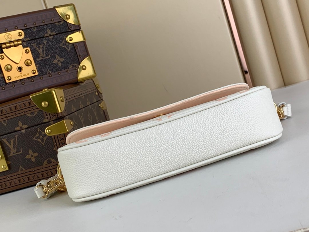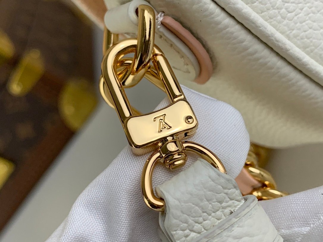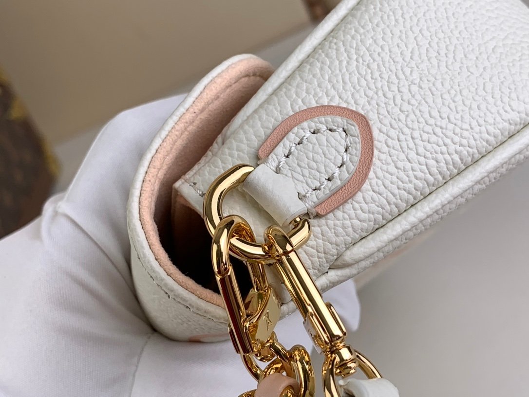 The handbag is made of Monogram Empreinte leather with a pink color scheme, and features a soft and comfortable close fitting design with a magnetic clasp flap. Adjustable leather shoulder straps and leather woven chains can be removed, providing multiple carrying options for day and night occasions.