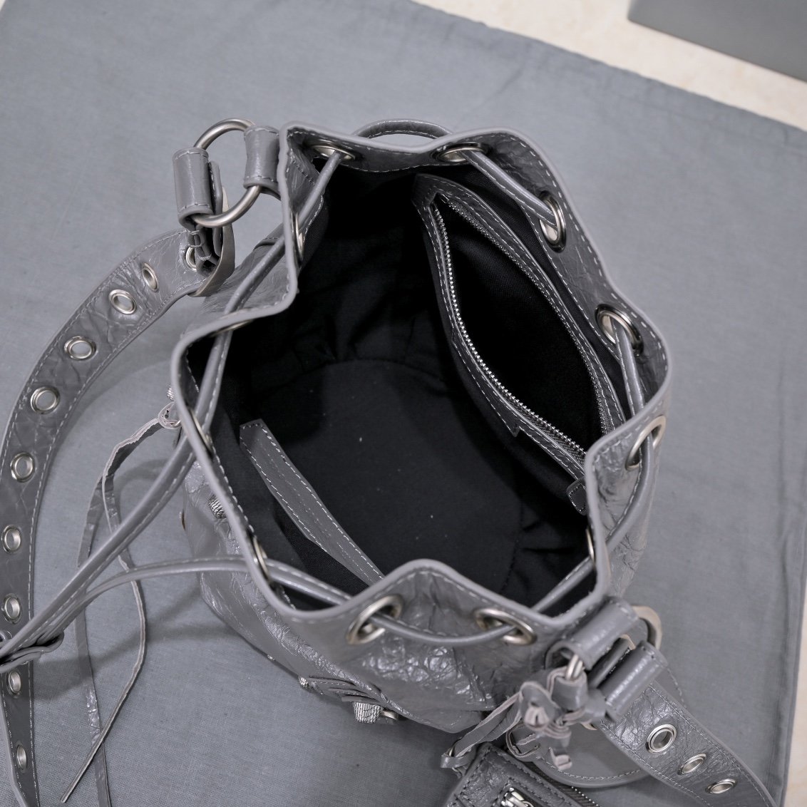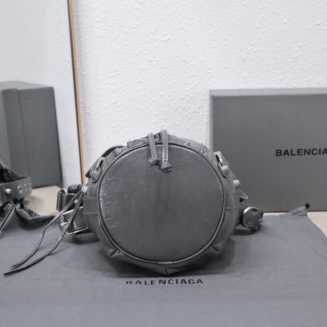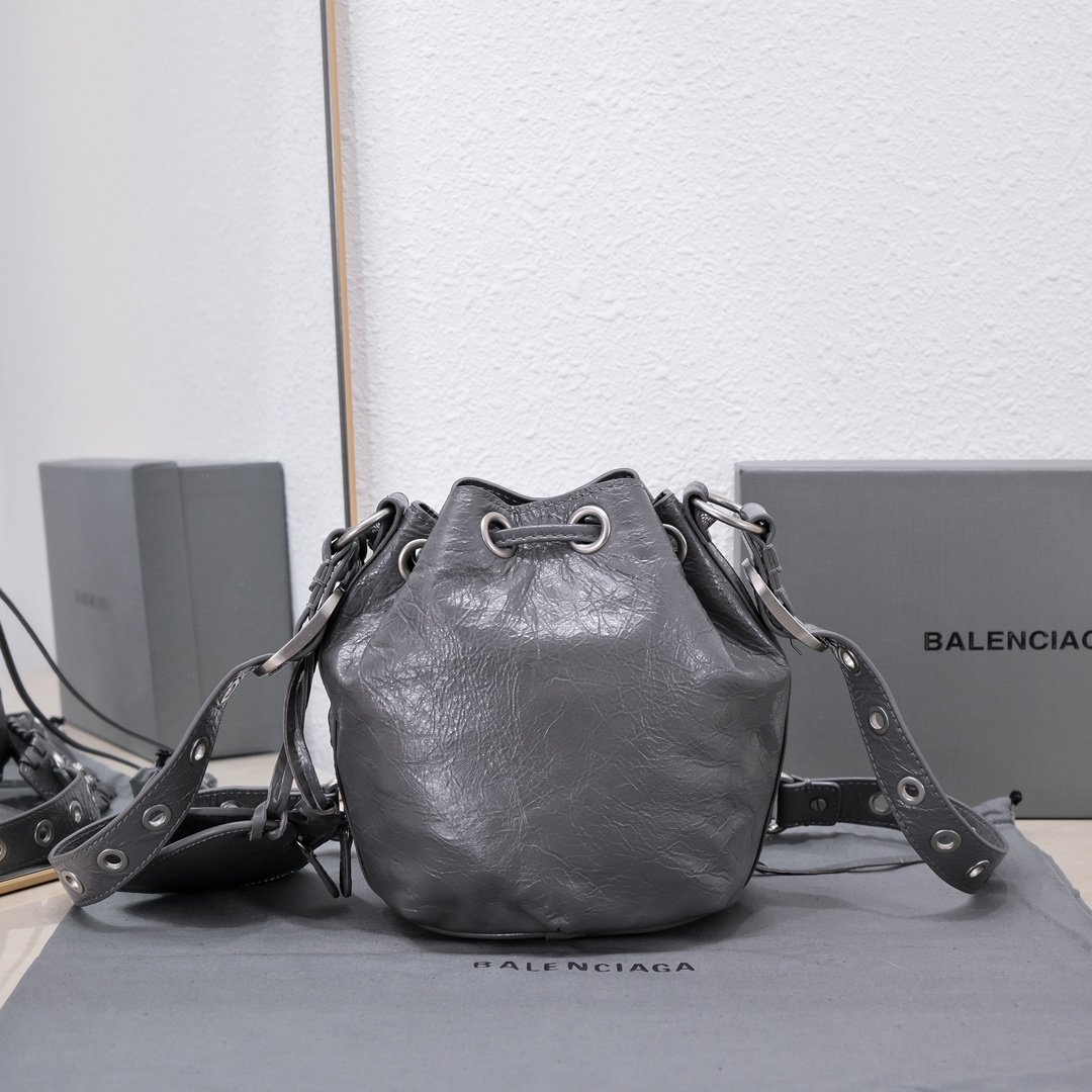 new small water bucket machine bag, imported bursting sheepskin, color: dark gray, size: 15 * 17 * 19 Balenciag α’s latest LeCagole bucket motorcycle bag in Paris is equipped with a heart-shaped small mirror, and the small truck bag is really cool
