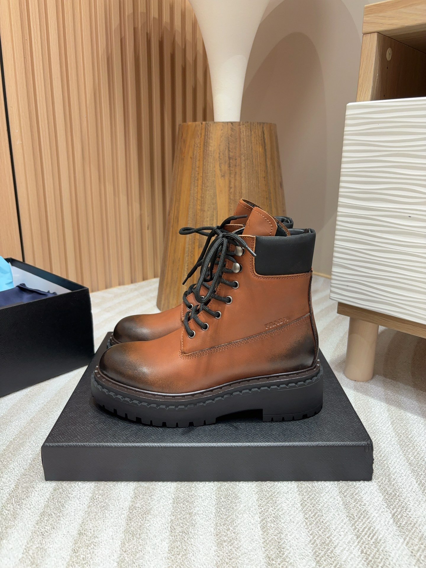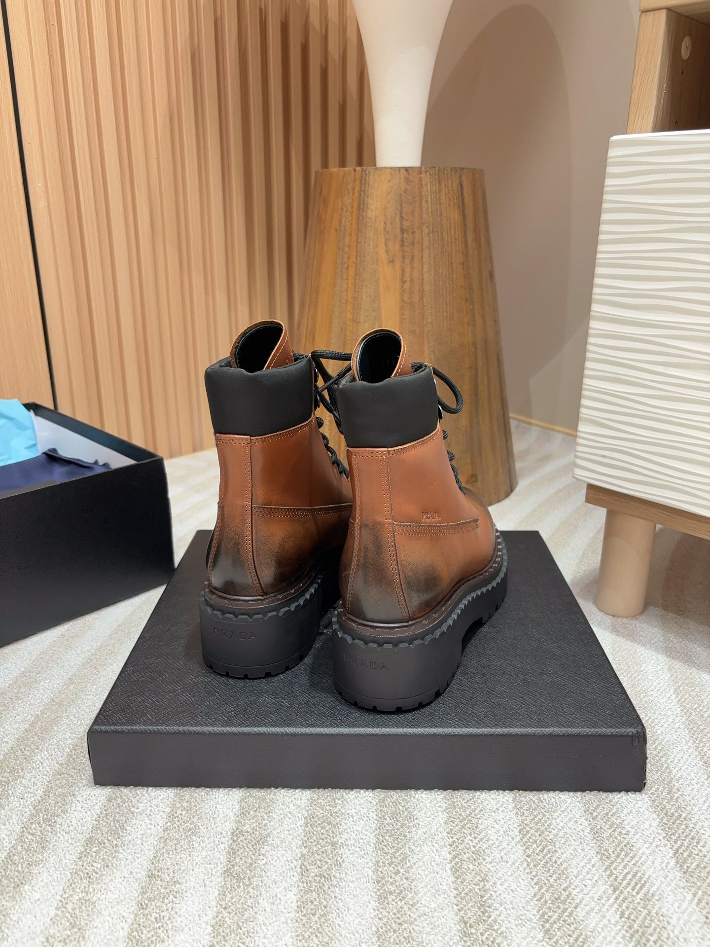This leather short boot incorporates recycled nylon details, making it versatile in style. The rubber sole is solid and lightweight, showcasing a sporty style and practicality. The vintage leather commonly used for exquisite shoes has been reinterpreted through the Prad * series, creating a unique modern mix and match design.