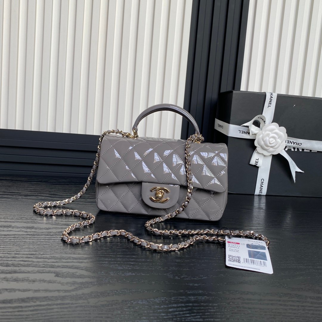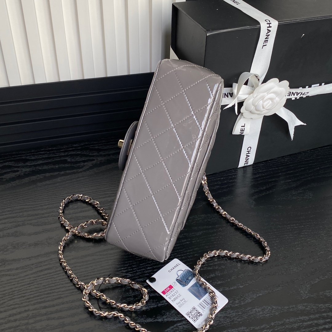 Chane1 ❄️ The 24K CF mini handle AS2431 has a look that is simply too high-end and has a cool feeling. It is very fashionable, versatile, and practical. It is made of patent leather and comes with a light gold metal chain ⛓️ A very simple style, who wouldn’t be tempted by it? Size: 20cm