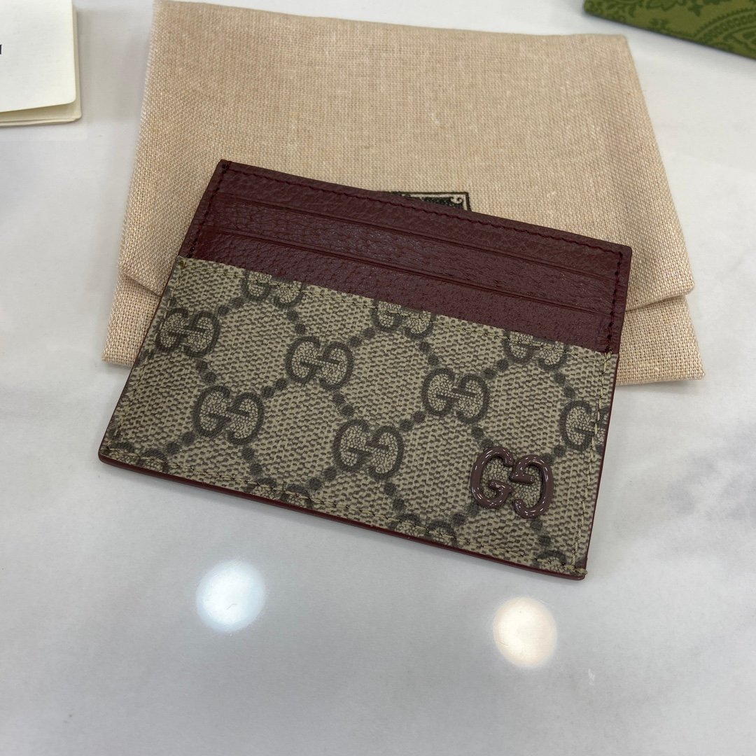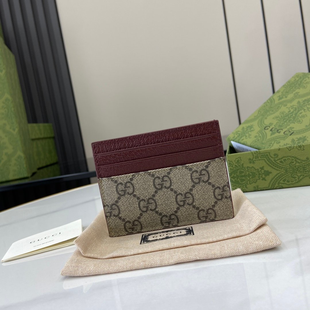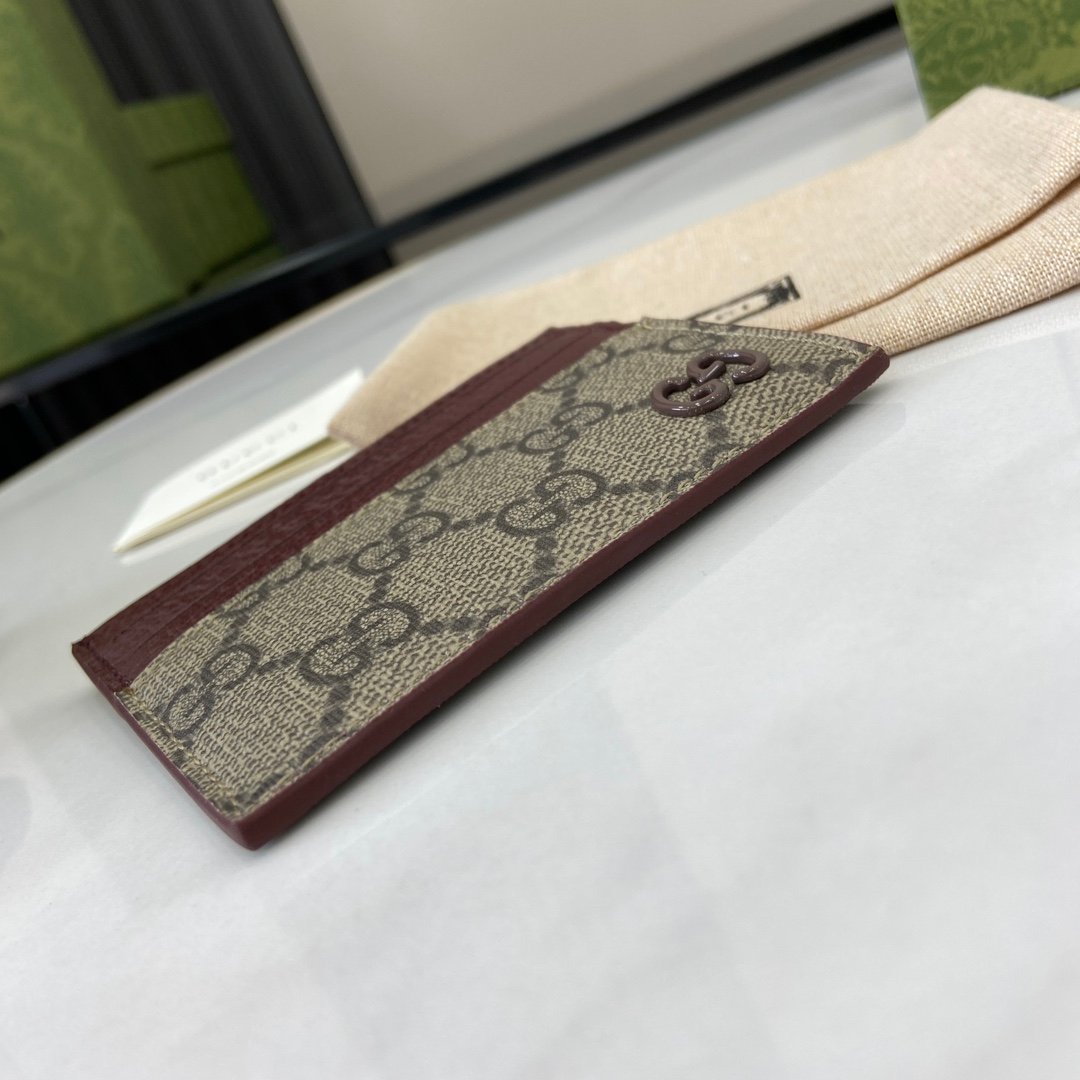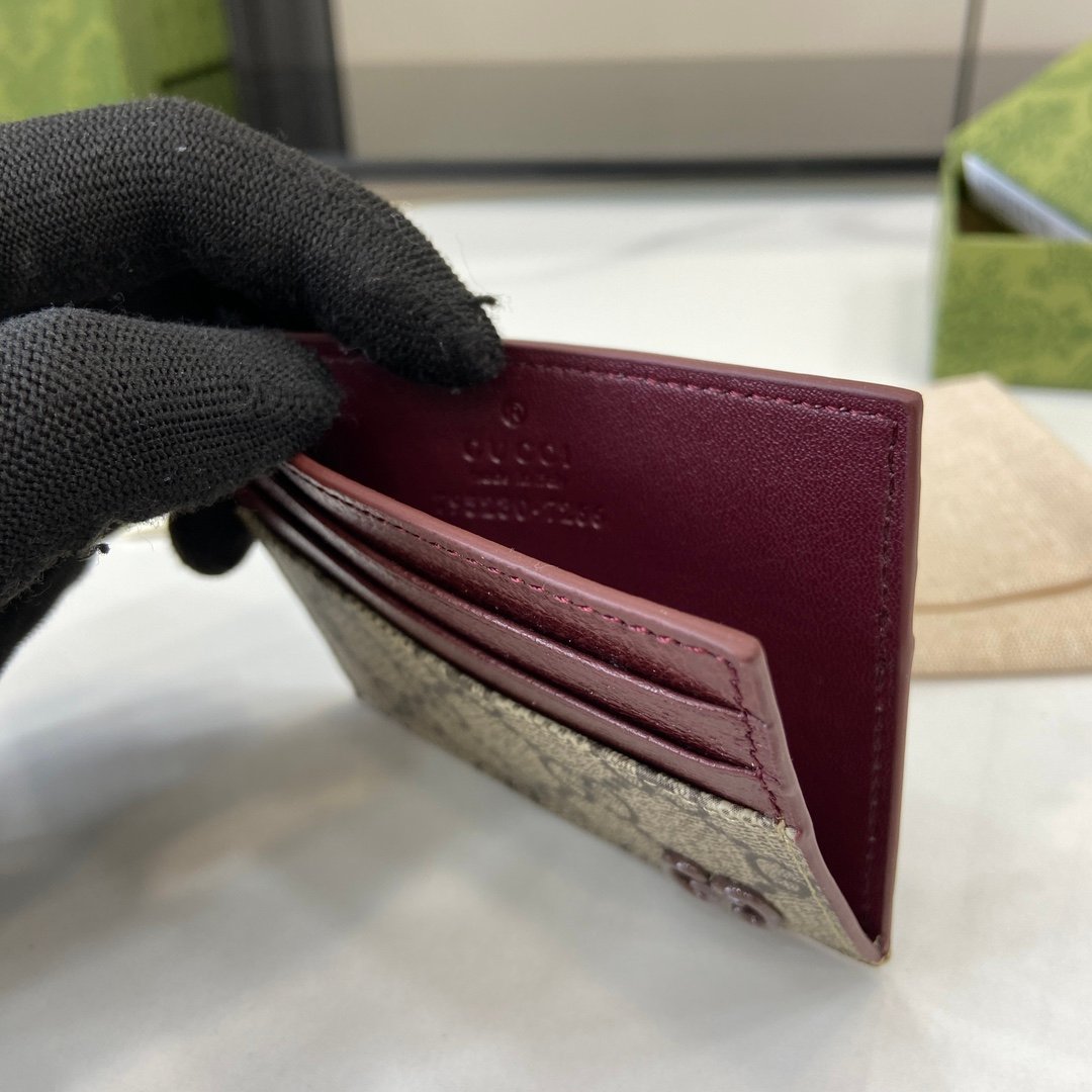 Complete set of original green box packaging with GG detail card clip. This card holder is crafted from beige and ebony GG Supreme canvas, showcasing the elegant charm of the brand’s collection details. Featuring small black GG accessory details, adding a touch of brightness to the overall design. This item features four card compartments, enhancing the overall charm of the design. Beige and ebony GG Supreme canvas, green leather rolled edges, brass fittings, gray ceramic effect finish, cloud fabric lining, GG details, 6 card compartments. Model: 795230. Size: 10 (width) x 8cm (height) Color: Jujube red/brown PVC. Italian Creation Weight: Approximately 0.03 kilograms