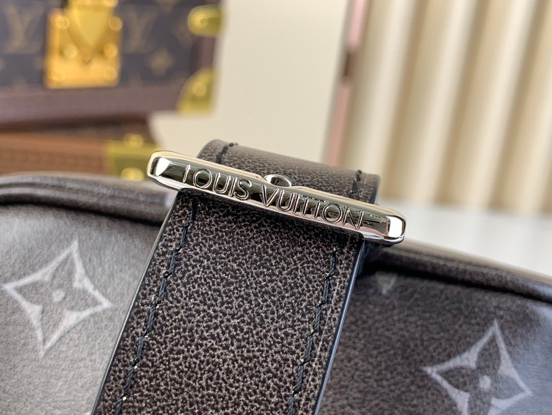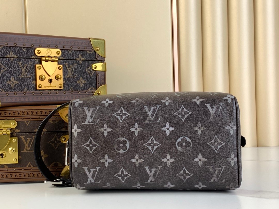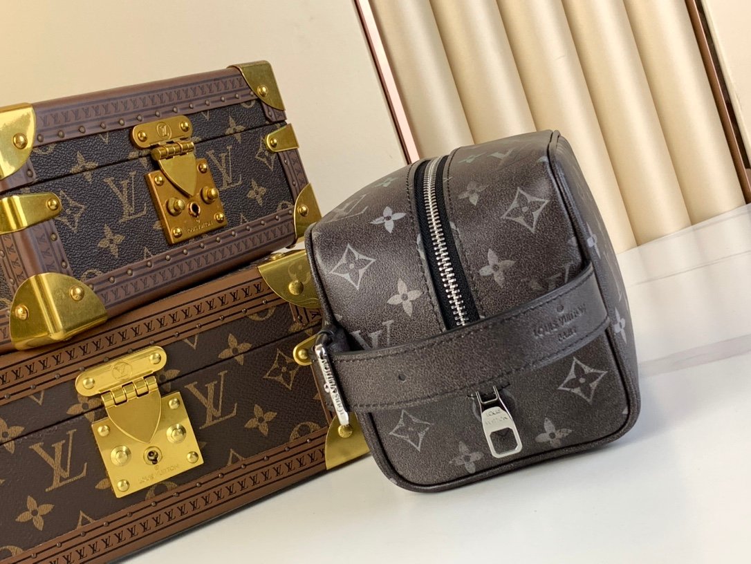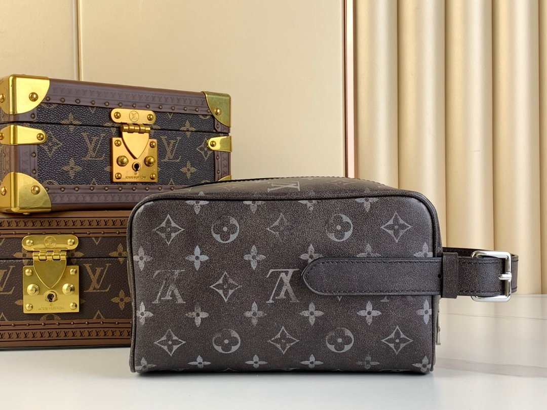 This Locker Dopp Kit wash bag is wrapped in Brushed Monogram leather with a washable lining, showcasing a vintage style with faded Monogram patterns. The adjustable handle is convenient for hanging on the bathroom hook and can also be used as an urban handbag.