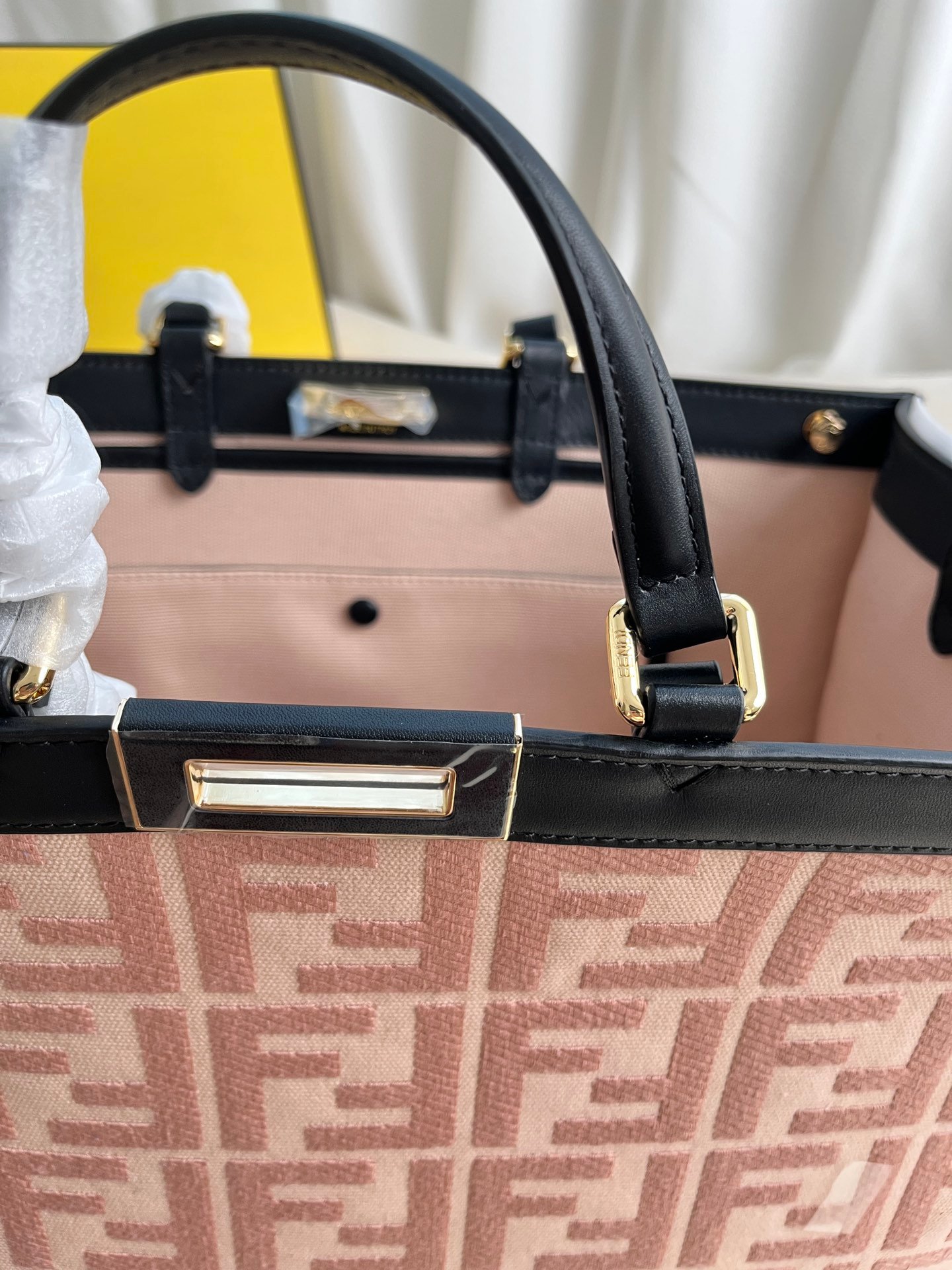 Peekaboo X-Tote handbag embroidered tote! There are internal pockets and iconic twist locks. Equipped with two handheld short handles and two shoulder mounted long handles. Thousand bird grid canvas material. Same color embossed embroidery FF decorative pattern. First layer cowhide edging. Golden metal piece. Size 40 * 12 * 29cm Style number: 1819