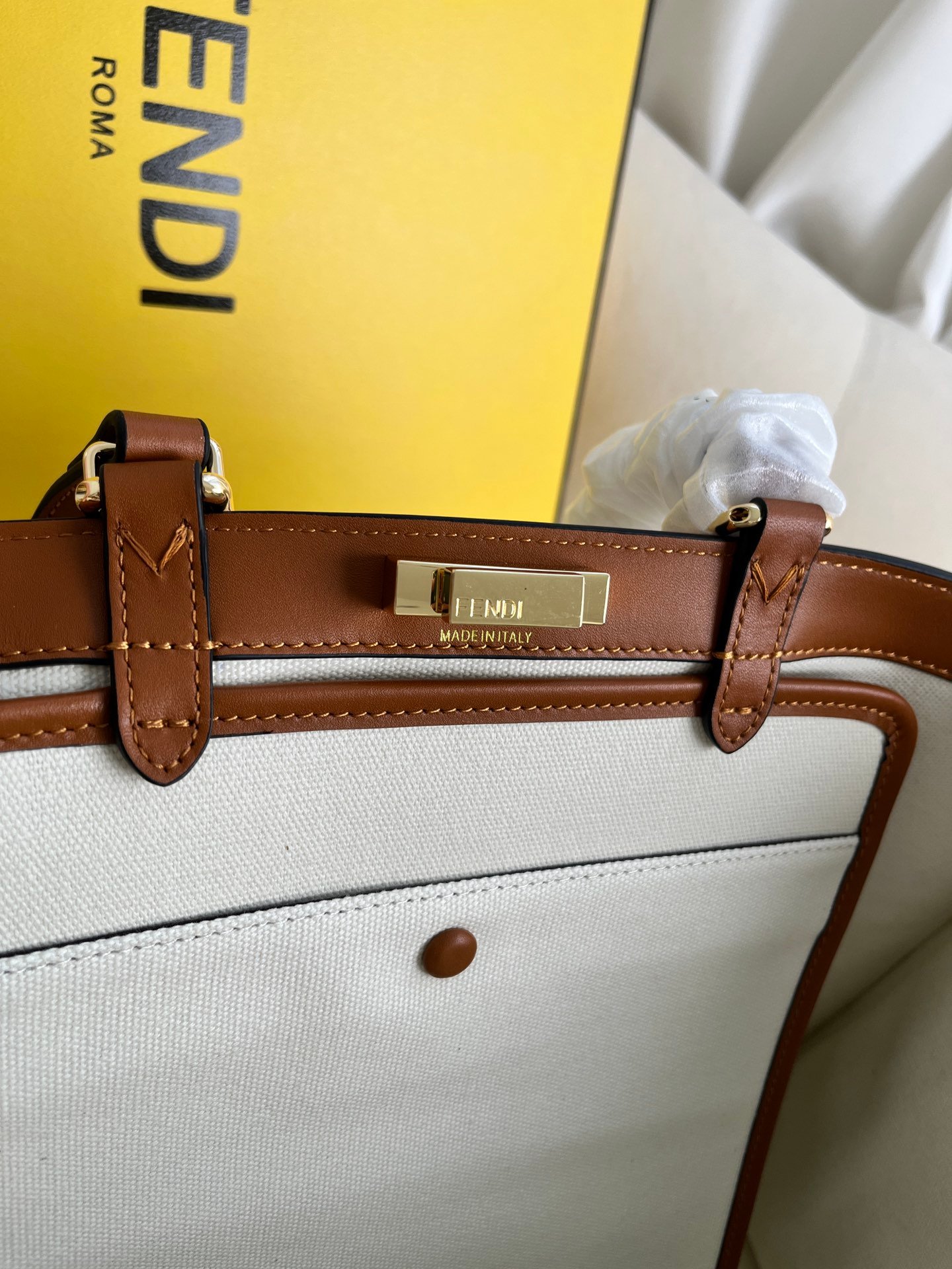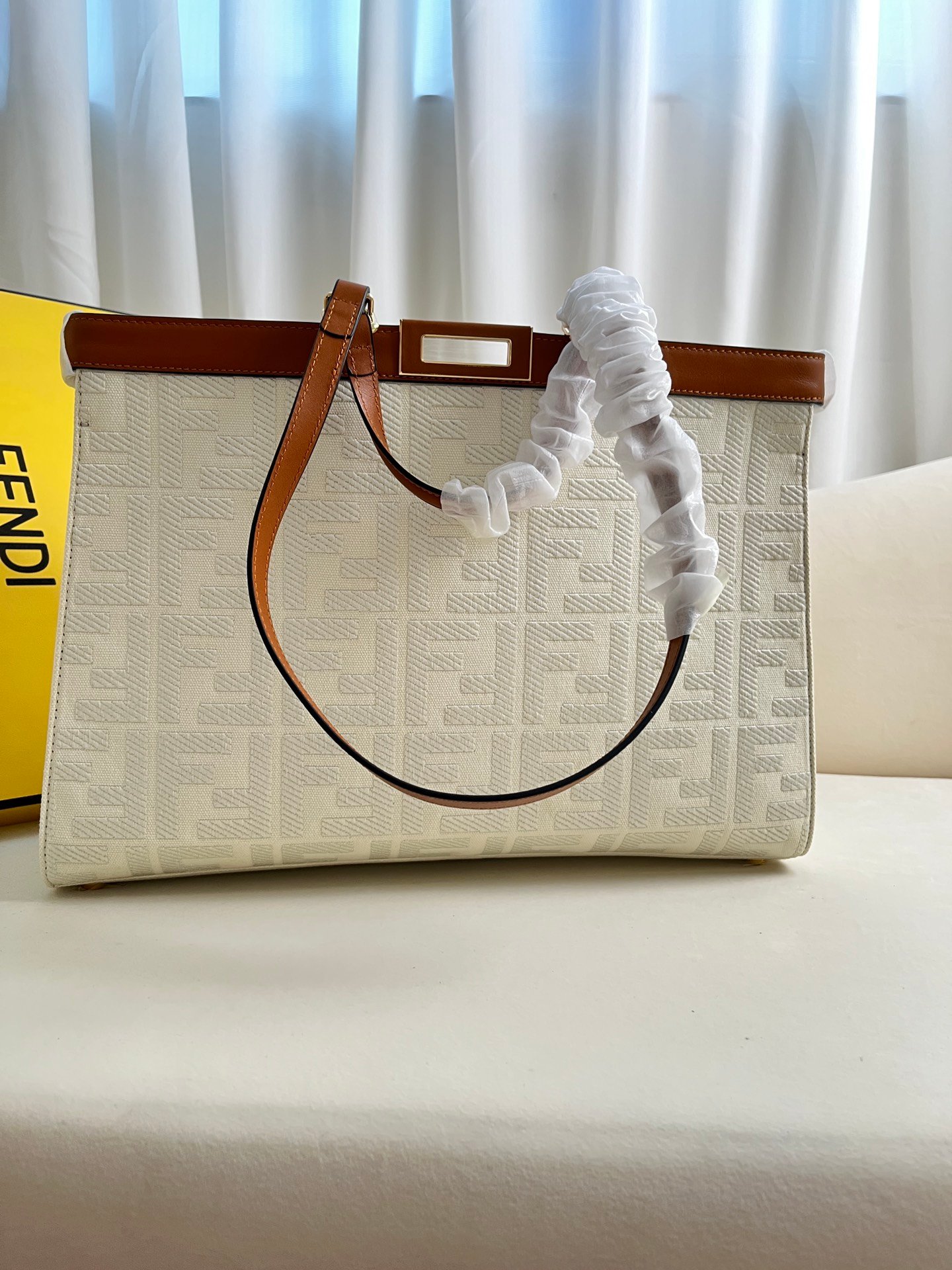 Peekaboo X-Tote handbag embroidered tote! There are internal pockets and iconic twist locks. Equipped with two handheld short handles and two shoulder mounted long handles. Thousand bird grid canvas material. Same color embossed embroidery FF decorative pattern. First layer cowhide edging. Golden metal piece. Size 40 * 12 * 29cm Style number: 1819
