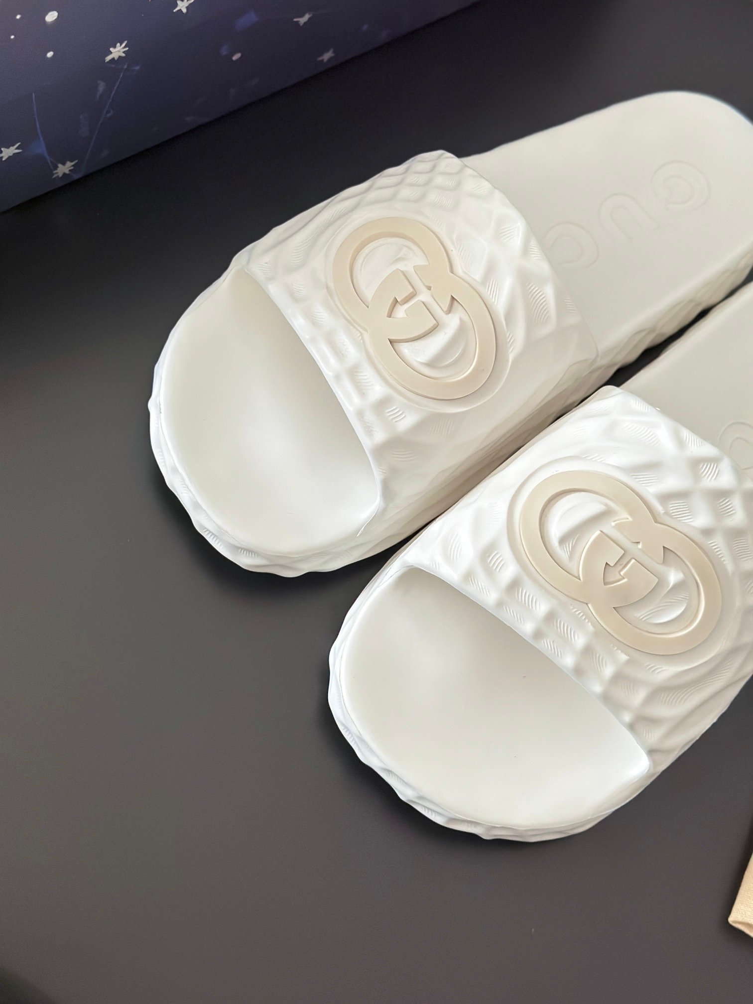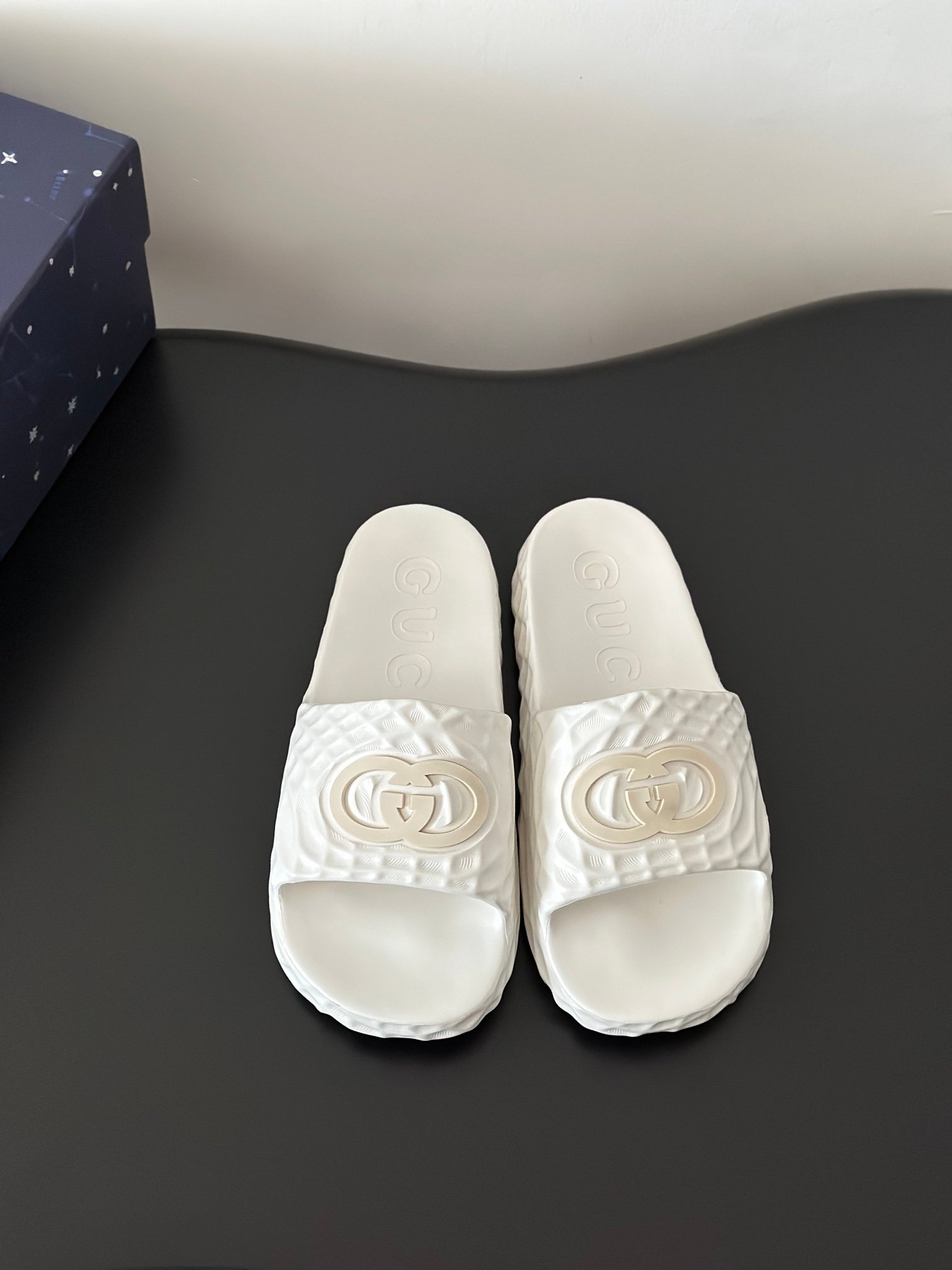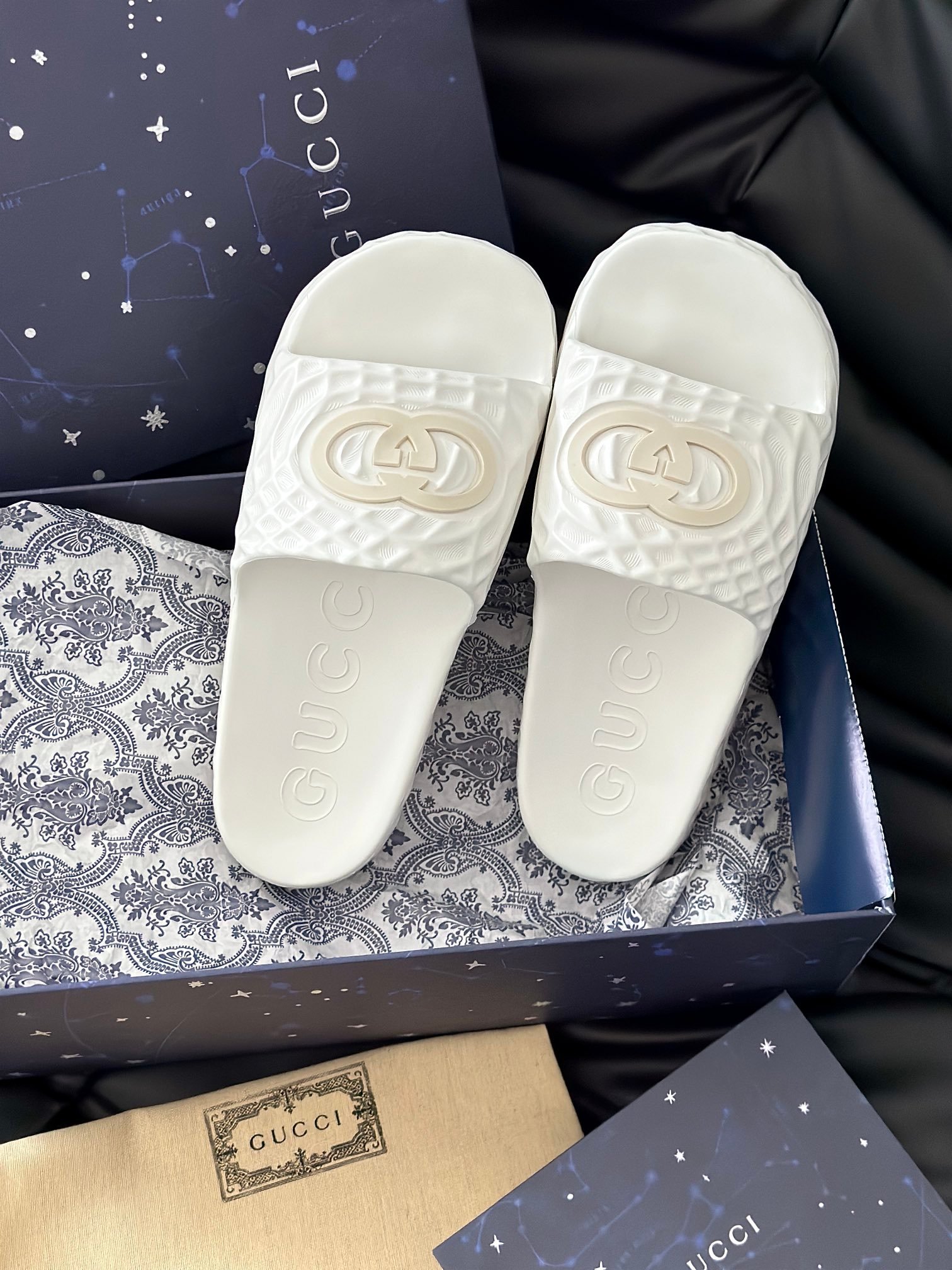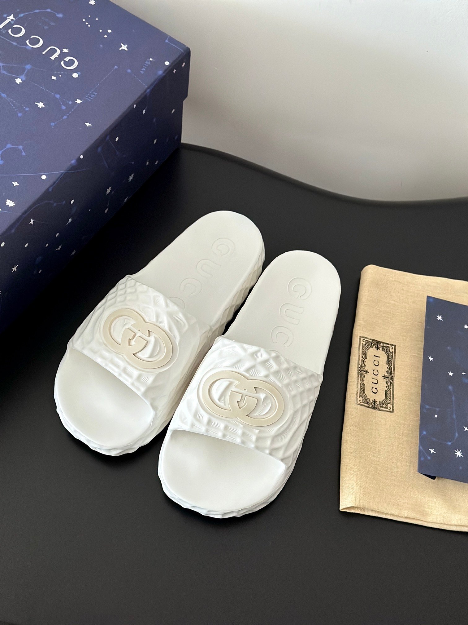 Gucc * couple slippers Lido series The design inspiration comes from the summer style of the Italian coast and beach clubs. This cool mop is crafted with woven rubber, showcasing delicate textures resembling ripples in water. The three-dimensional interlocking double G logo adds charm to the entire product with the original TPU foam integrated molding material. Size:35-45