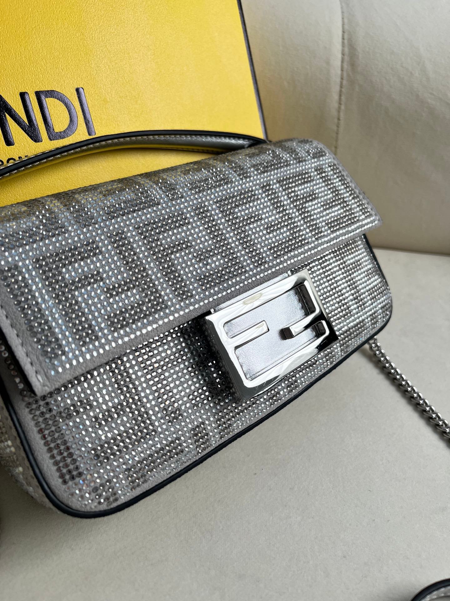 FENDI 2023FW Women’s Autumn/Winter New Toter Hot Pot Color Double F Flash Diamond Full Frame Decoration with FF Pattern Jacquard Hot Pot Diamond, Adorned with Transparent sequins. Adorned with FF buckle. Featuring a front flip cover, magnetic buckle, internal compartments lined with dark brown fabric, zipper pockets, and gold metal components. The handbag is equipped with a detachable leather handle and shoulder strap, which can be carried by hand, shoulder back or crossbody.