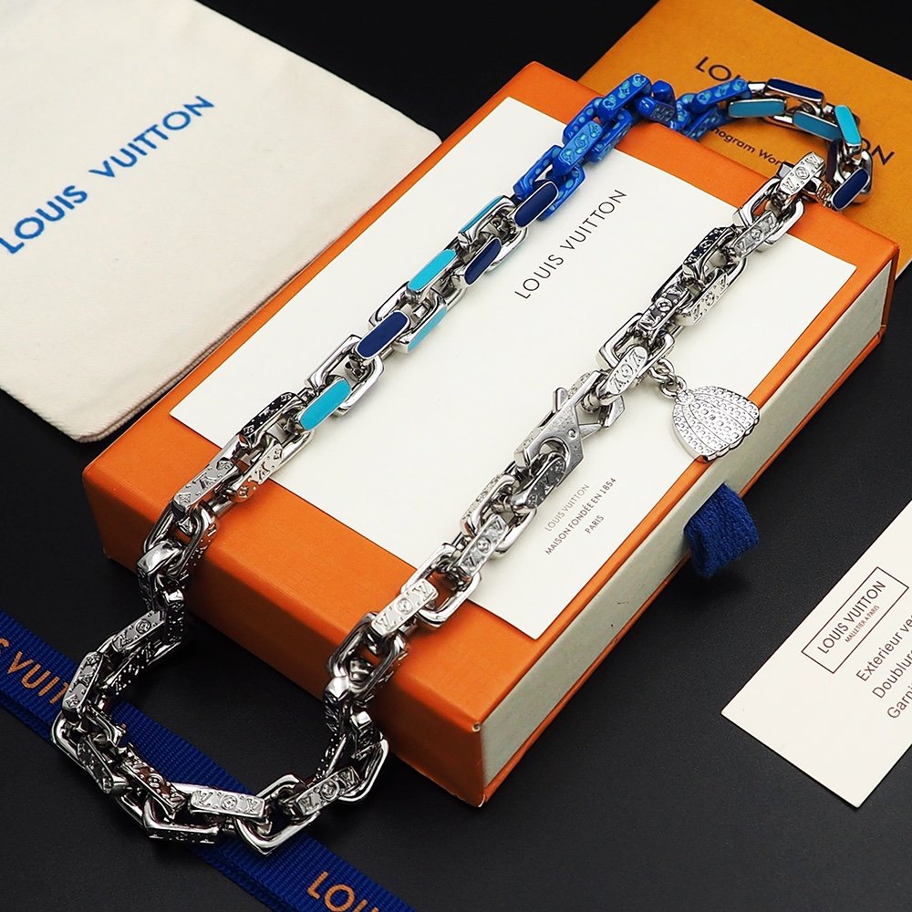 Louis Vuitton rectangular metal chain link engraved blue bamboo necklace