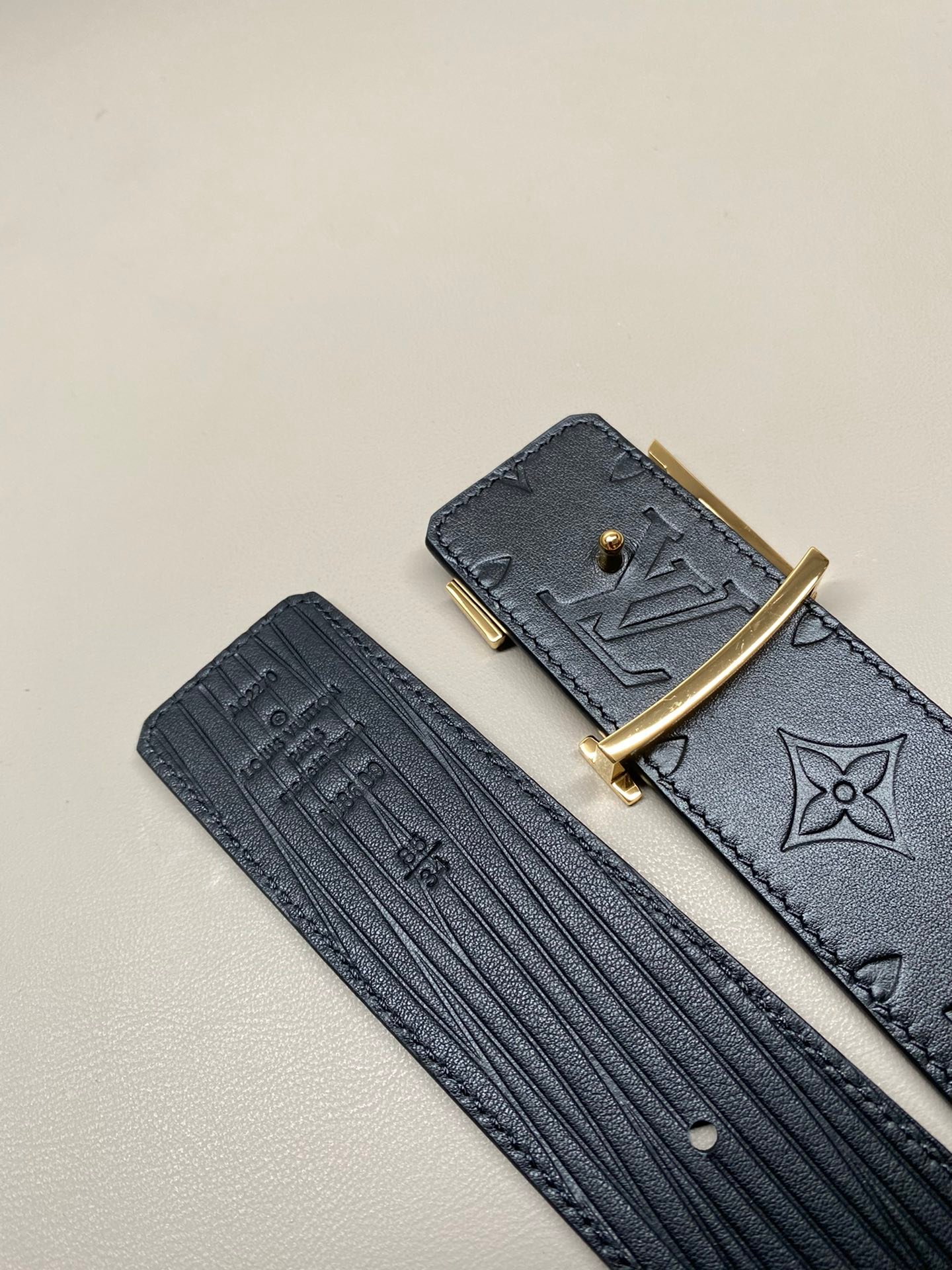 LV Initiales 40mm double-sided waistband made of imported calf leather material with a soft touch, one side featuring large water ripples and the other side featuring classic embossed patterns -220