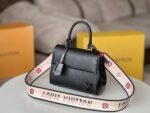 This Cluny mini handbag showcases a two-fold fashion of detachable jacquard shoulder straps: the Louis Vuitton logo declares the brand identity, and flipping it reveals the silent blooming of Monogram flowers. Epi leather body paired with silky resin LV logo. Removing the shoulder strap enhances the sense of formality.