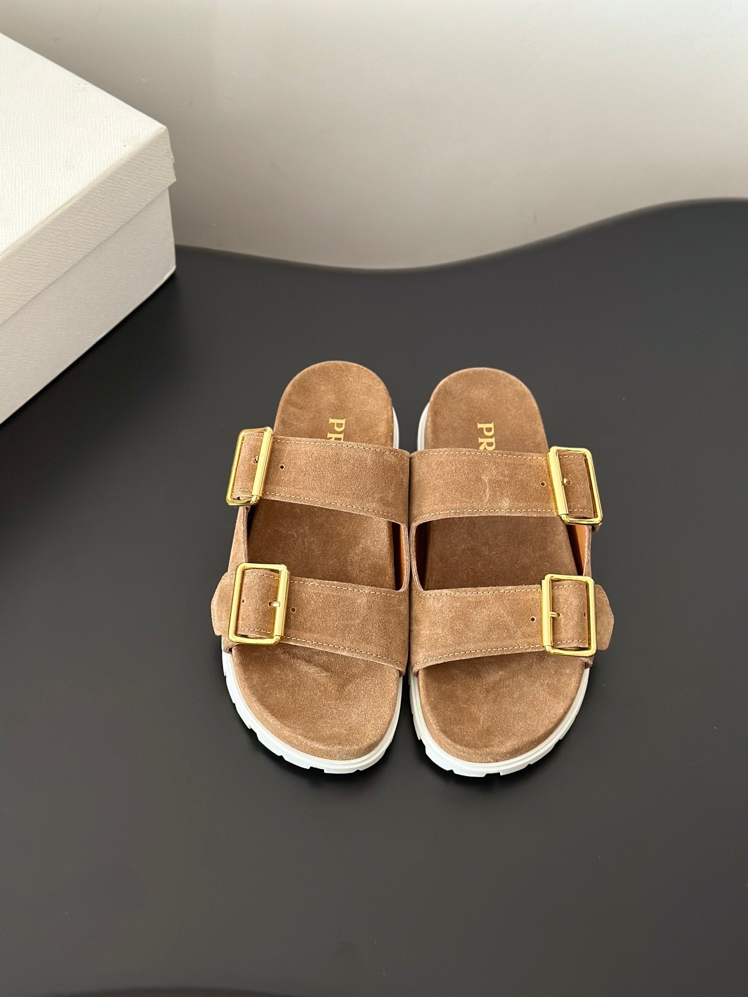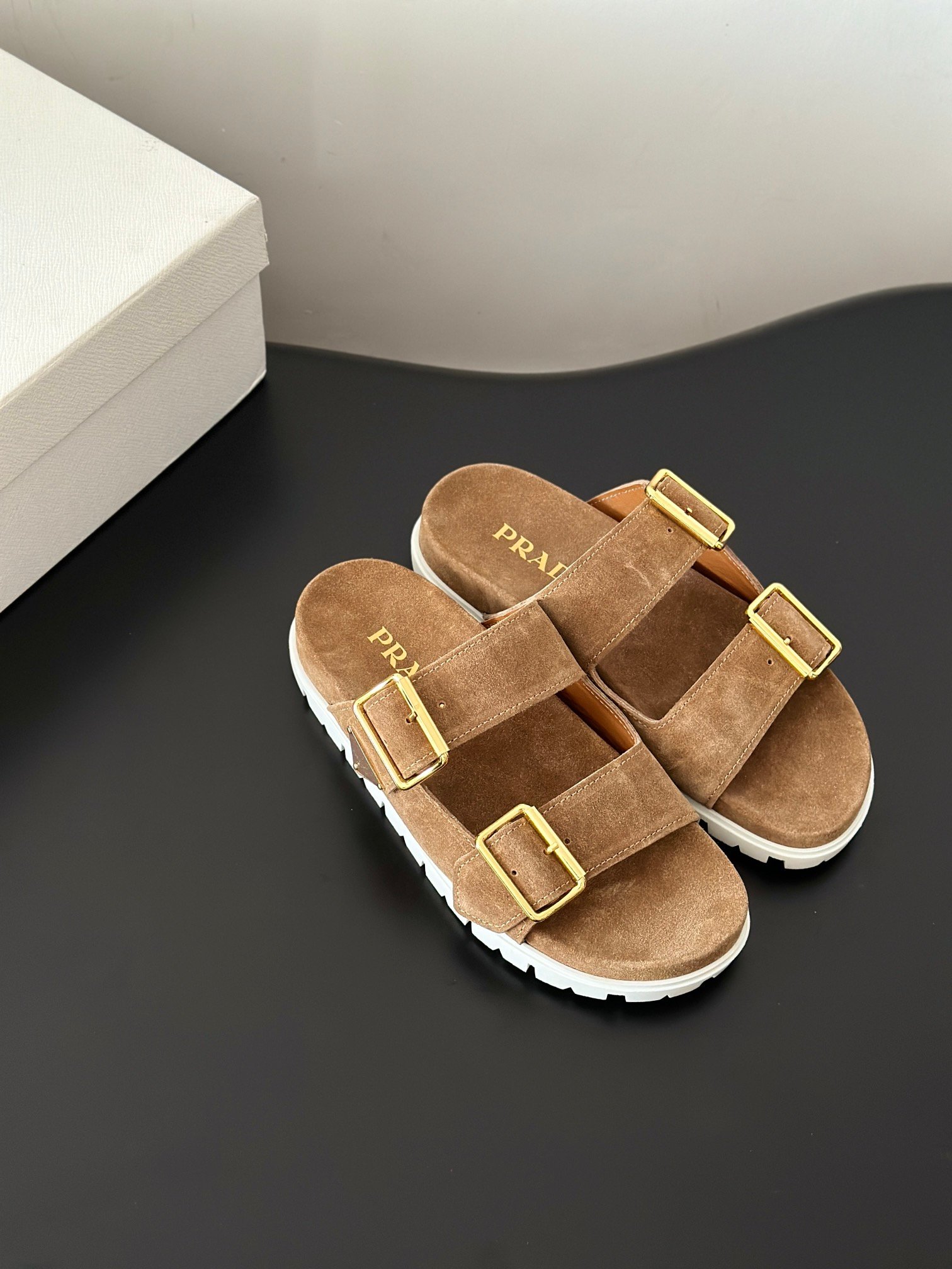 PRAD * Latest Spring/Summer Serrated Roman Sandals The retro and trendy gear teeth make the entire shoe lightweight and comfortable, and the double buckle design is simple and elegant. The iconic metal triangle logo paired with ancient beach sandals design, each element stepping on a fashionable point! The upper of the shoe is made of imported top layer cowhide, inner cowhide, and original molded TPU outsole Size: 35-40 (40 customized
