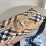 Slanted backpack, decorated with fine woven Burberry plaid. Adorned with equestrian knight emblem (EKD) decals, featuring a solid color lining design. Paired with a B-shaped zipper head, it has one outer pocket that can accommodate various small items. From Burberry’s classic collection, interpreting essential wardrobe styles with a distinct brand style.