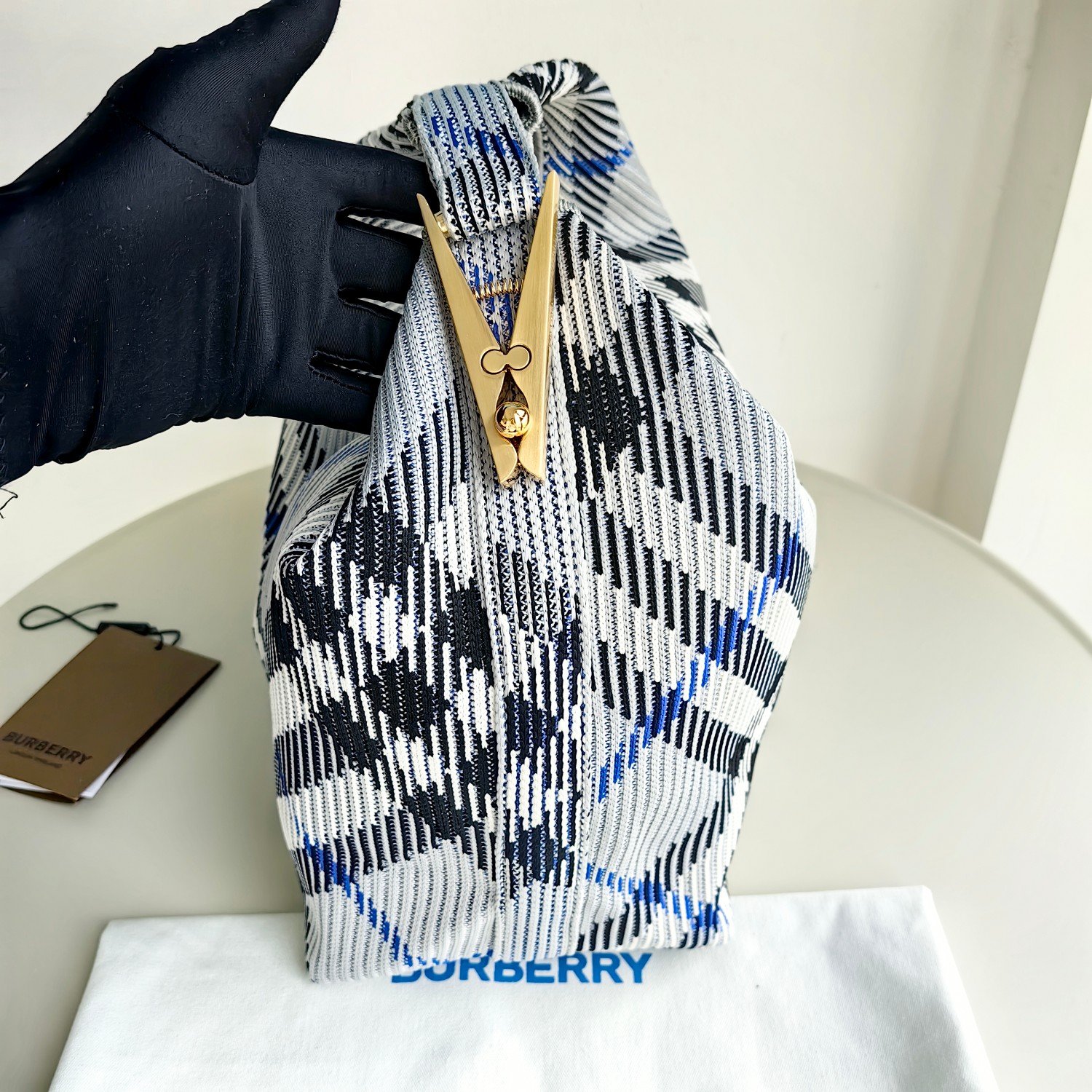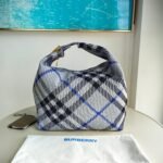Soft standing bag style, knitted in Italy, decorated with Burberry plaid. Lightweight texture, adopting an unlined design; The hem style buckle is engraved with the Burberry logo, making it easy to secure the curved top handle.