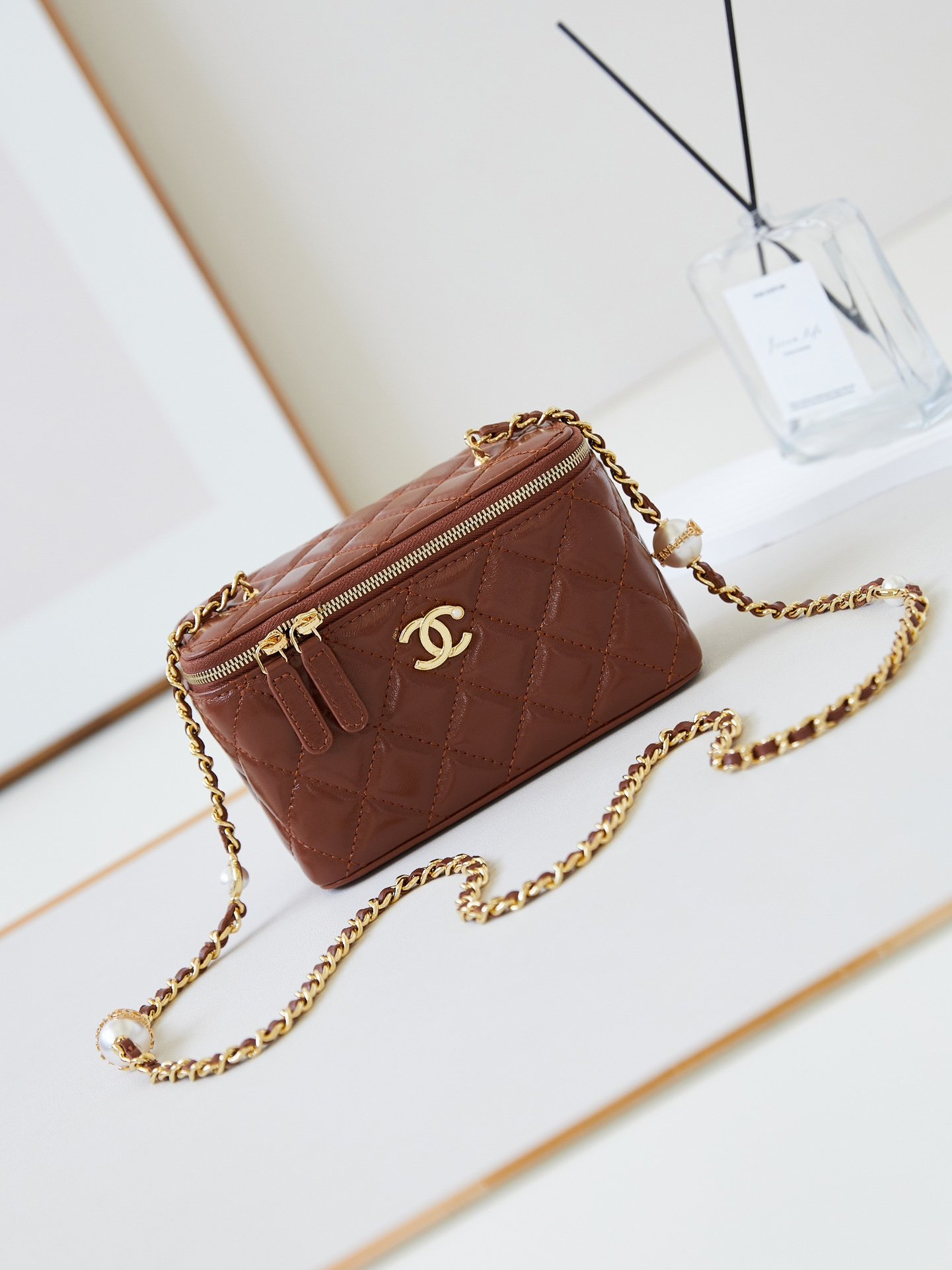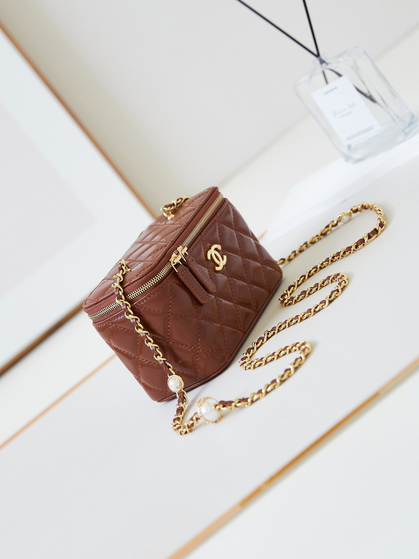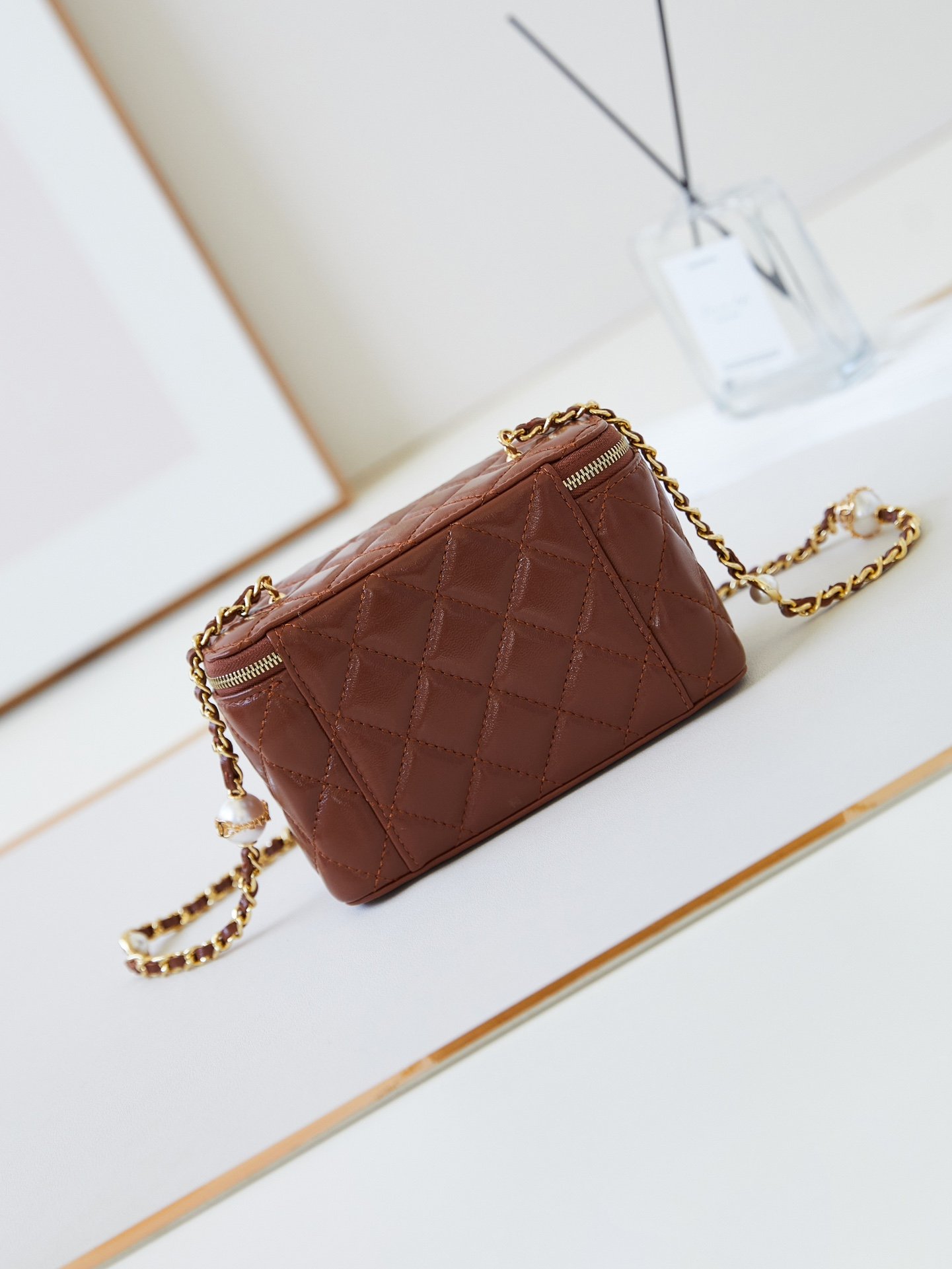 The 24K pearl makeup bag is super luxurious, made of high-quality sheepskin material with excellent glossiness and hand feel. What’s even more attractive is that The exquisite craftsmanship of the chain with pearl letters is so satisfying that it really touches my heart Style number A Size 10-17-8 Packaging