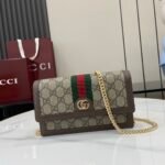 The world of GG Ophidia continues to evolve with the seasons of new shapes and materials. Gucci’s non removable alphabet continues to enrich new designs with its unique logo. This mainland style wallet is made of the historic GG Supreme beige and vinyl fabric, featuring Double G details. Fabric GG Supreme beige and brown leather finish, light gold finish, Moliere Double G interior: 12 card slots, two banknote compartments, a wallet pocket with a padlock, and two flat pockets under the card slots. External: a flat pocket with a detachable chain, height (light) 60cm close button.