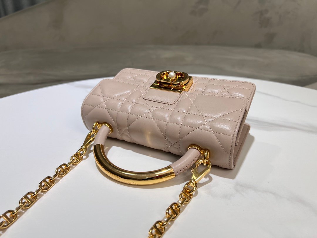 This Dior Ange handbag is a new addition to the 2024 autumn ready to wear collection, launching a brand new collection with an elegant and fashionable aesthetic style. Crafted with carefully crafted apricot colored cowhide leather, adorned with oversized wicker grain stitching, a stiff retro gold finish metal top handle engraved with Christian Dior, r Paris logo, and a CD clasp embellished with resin beads on the flip cover. The silhouette is sewn with triangular lining, paired with two spacious compartments and a pocket, which can store various daily necessities. Mini style, elegant design, adjustable and detachable chain shoulder strap composed of gold decorated metal CD links embellished with resin beads, can be carried by hand, shoulder or crossbody.