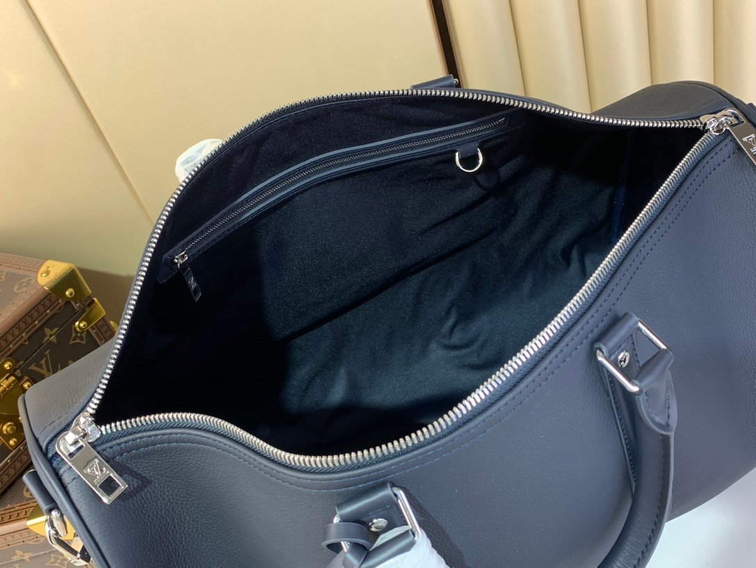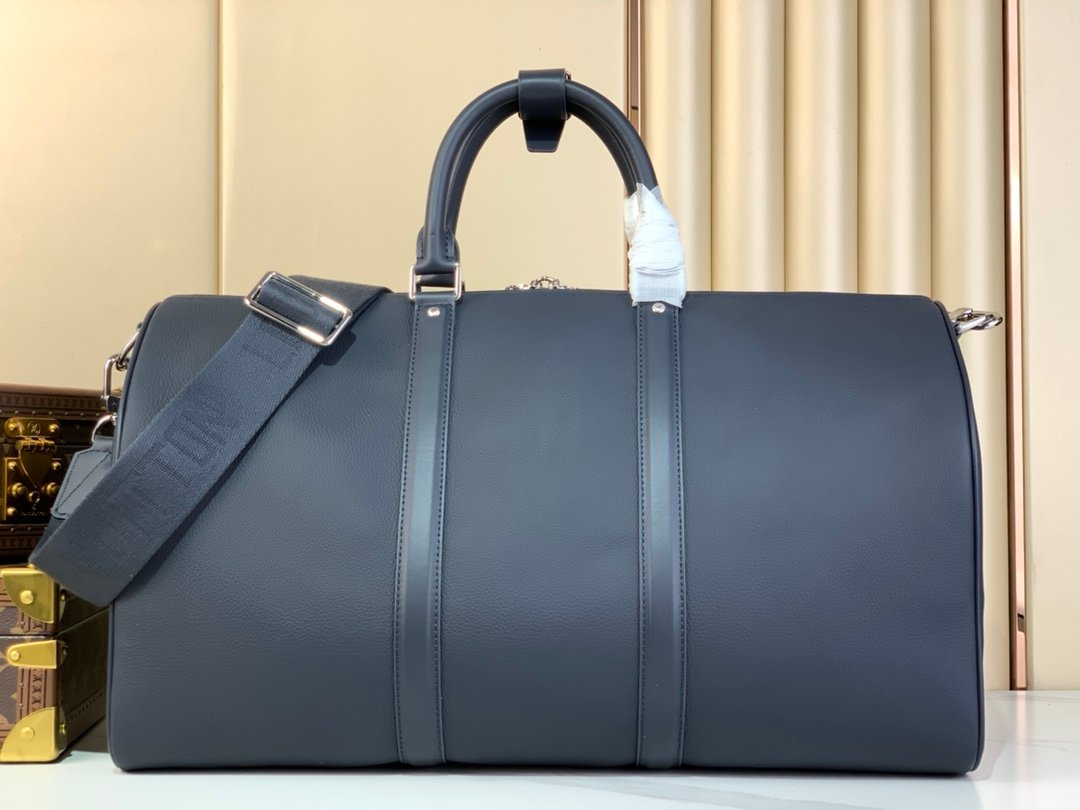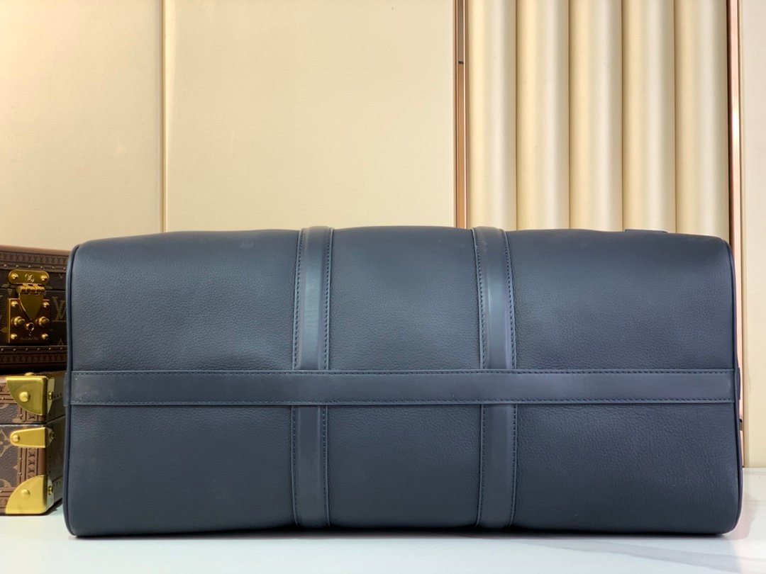 Introducing the new Keepall BANDOULI È RE 50 travel bag in Aerogram version, made of deep blue soft grain leather. The understated details such as the deep blue letter logo, customized leather nameplate, and detachable jacquard shoulder strap showcase the brand’s style. The humanized size design and multiple carrying options make it a versatile travel item.